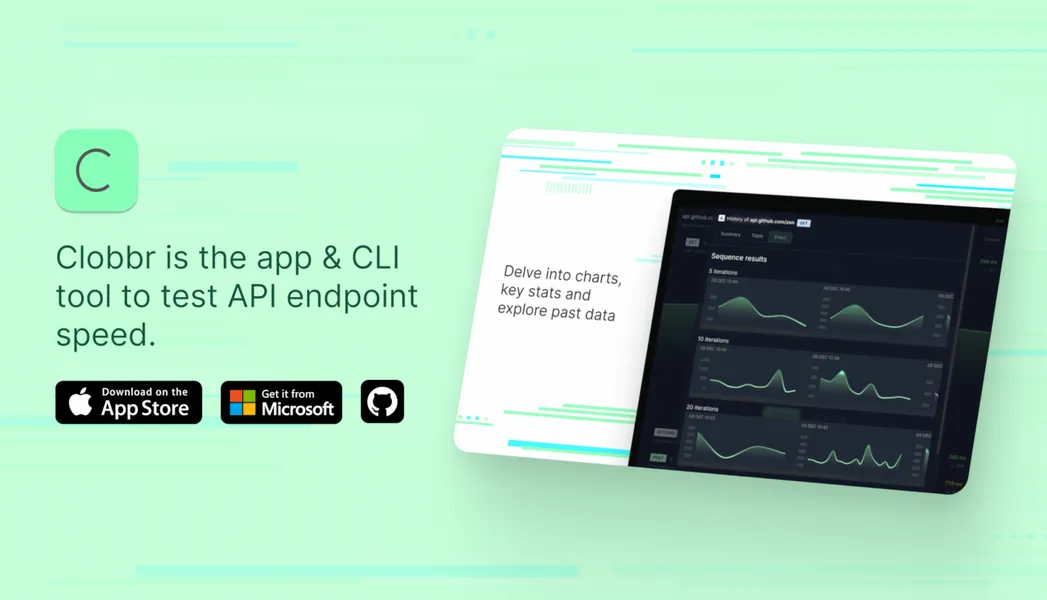 - Trendlines for the visualization of data across all charts - Automated GraphQL detection based on payload data - CI/CD Integration for automatic API endpoint testing - Advanced debugging for failing requests via browsing historical data - Control over visualisations with alternatives to line charts and optimized views for larger screens - Features for data management including autocomplete and linting supports - Easy scripting testing and ability to delete outdated single runs - Furthermore, Clobbr is open source and accepts contributions on GitHub.