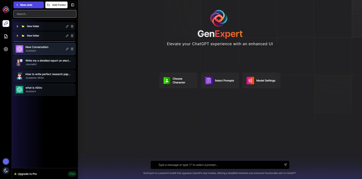 GenExpert stands out as an indispensable chat application that enriches your conversation journey. By introducing highly dynamic characters and creative prompts, it sets a new standard for chat interfaces. Characters serve as the cornerstone of the chat model, offering system prompts that allow you to guide the conversation's direction.